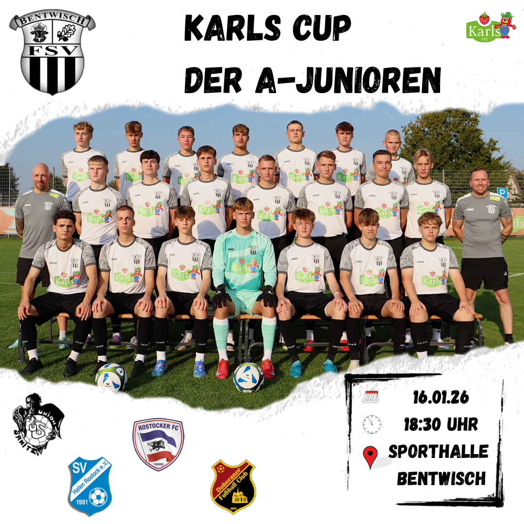 16. Januar 2026 Karls Cup der A-Junioren Datum: 16.01.2026Uhrzeit: 18:30 - ca. 22 Uhr Teilnehmer:FSV BentwischDoberaner FCUnion SanitzRostocker FCSV Hafen Rostock Veranstaltungsort: Sportplatz Bentwisch Karte/Routenplaner: